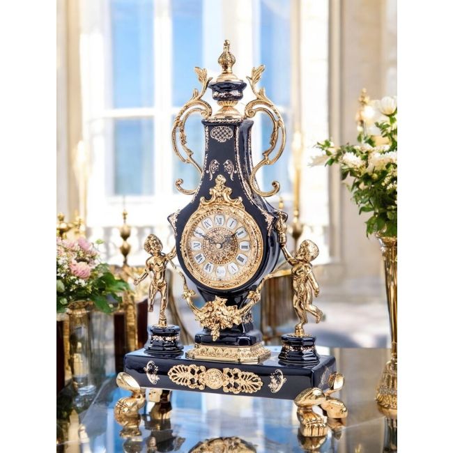 Horloge impériale en céramique raffinée, avec anges et détails dorés, fabriquée à la main.