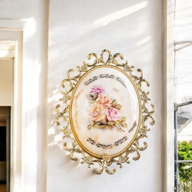 Médaillon en céramique fine avec d'élégantes décorations florales et détails dorés, fait main.